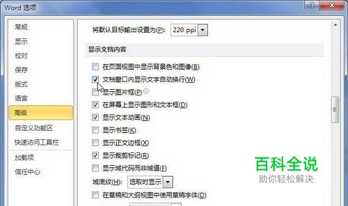 第2步,打开“Word选项”对话框,切换到“高级”选项卡。在“显示文档内容”区域选中“文档窗口内显示文字自动换行”复选框,并单击“确定”按钮,如图2012011504所示。 图2012011504 选中“文档窗口内显示文字自动换行”复选框