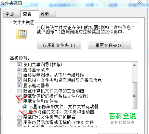 选“文件夹选项”,然后点击“查看”,出现下图:去掉前一个红钩处的勾选,钩选第二个红钩处。点“确定”。