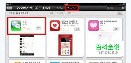 不过这时我们可以点击屏幕上方的“iPhone App”,就会看到在搜索列表中看到“微信”应用了。由于iPhone与iPad都是使用苹果iOS系统,因此iPad上也可以安装iPhone应用,之后我们点击“安装”,等待下载安装完成。