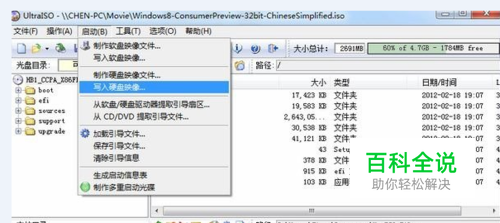 开始制作U盘系统盘:使用UltraISO打开下载好的Win8中文简体ISO文件,点击启动--写入硬盘映像。