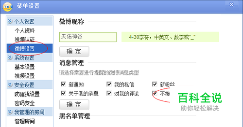 然后我们在个人设置→微博设置选项卡中,勾选不不接受陌生用户的消息选项,然后点击下方的确定按钮即可,如图所示: