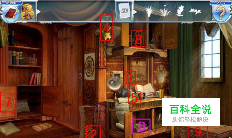 在这个图中可以得到10个物品。其中2处在物品后面,只能看到一点点绿色的叶子,点缝里的绿色可以得到;7处的柜子是需要在A处地毯下面得到的钥匙打开的,在柜子里得到物品放着药的碗;8处的物品在书后面;在B处得到钥匙打开9处的箱子,得到物品;拿到这10个物品后去下一个图。