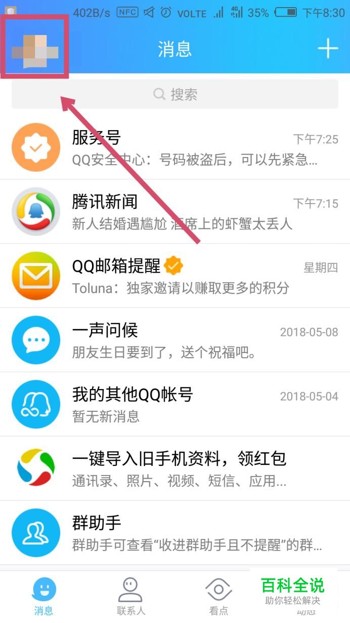 打开QQ,在主界面左上角找到你自己的头像,点击进入。