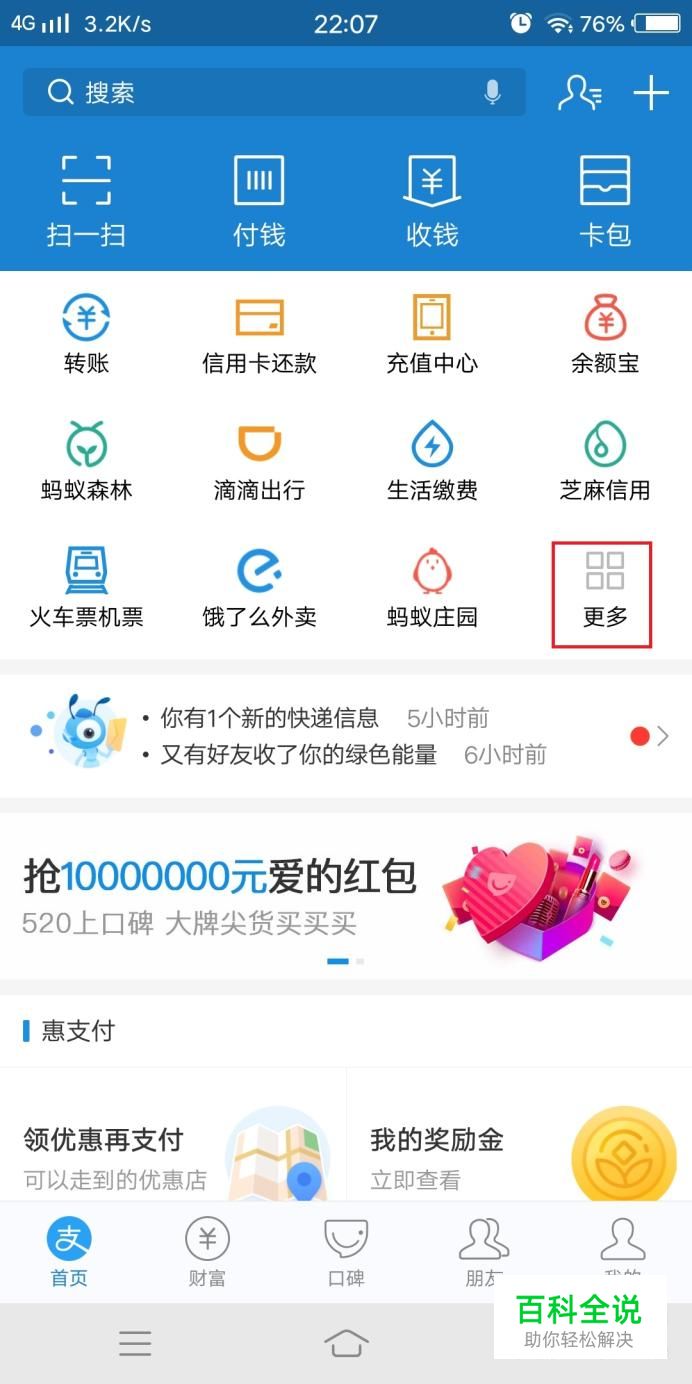 手机打开支付宝APP,在应用菜单中点击更多,如图所示