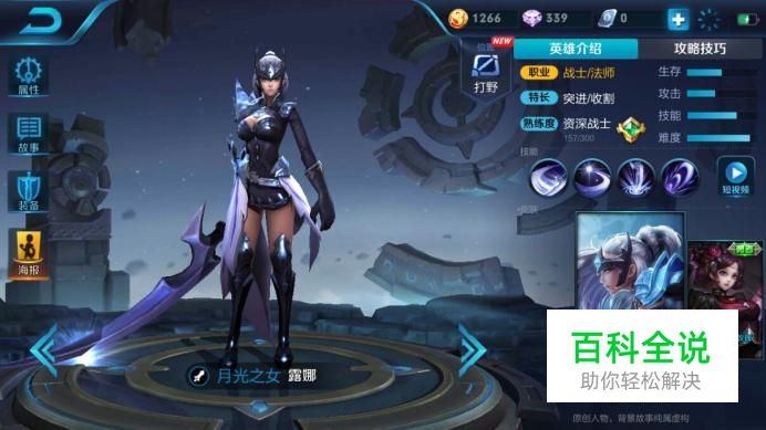 首先,我们先来了解一下“露娜”这个英雄,这是一个法师兼刺客,一般会选择打野,然后第一个技能是“弦月斩”,第二技能是“炙热剑芒”,大招是“新月突击”。