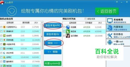 在我们完成系统精简这一操作时,在界面右侧的方框中也会有,内置预装,修改信息,一键root功能,可直接进行操作。如:内置预装功能,内置你的apk到rom包,可直接勾选左侧手机必备应用中的应用名称,然后点击添加即可,如果想内置自己的apk,直接从联盟下载推广应用,然后选择添加本地apk即可完成,添加错的话还可以点击移除。“信息修改”“一键root”等功能,根据自己的需求选择。一键完成后,就可以开始封装了