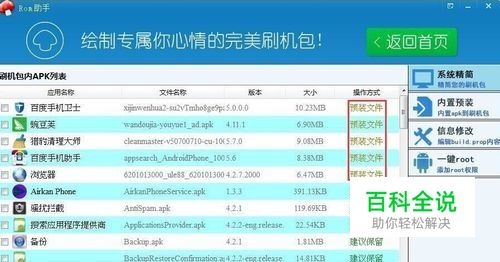 二:编辑修改刷机包 打开rom助手,进入主界面,我们可以先点击“系统精简”功能,选择下载的rom包将其加载进去,等待加载完成,会直观的显示刷机包内APK列表,预装软件,系统软件会清晰的排列,可根据提示删除那些不必要的预装软件,勾选即可清理