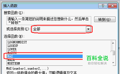 在弹出的窗口中,“或选择类别”中选择“全部”,在“选择函数”下面选择MAX。如下图所示。
