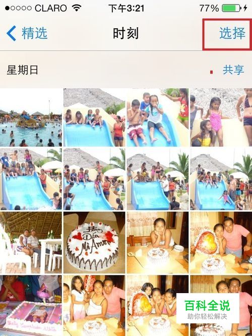 检查无误后,打开照片。进入照片或者相册都可以,打开照片后,点击右上角的【选择】,然后批量选择要分享的照片。(这里就是本人手机里的照片,没打马赛克,请勿转载)