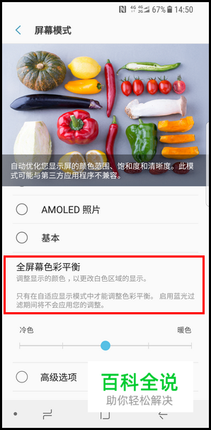 1.全屏幕色彩平衡:设置-显示-屏幕模式-全屏幕色彩平衡。