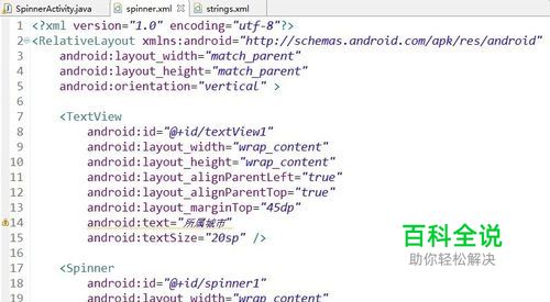 按照正常流程,首先应先把对应的View显示出来,需要用到TextView和Spinner控件即可,所在Form Widgets即可找到,相关代码和示例图如下。