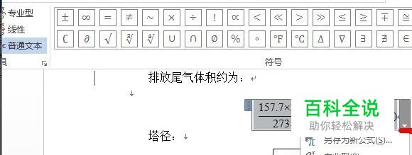 word2007和word2010:两者方法基本相同,以word2010举例。 将公式编辑好之后,单击公式框右下角的下拉三角,会将公式全部选中,此时页面上方会出现公式工具栏,单击左上角的”普通文本“,使之成为选中状态,