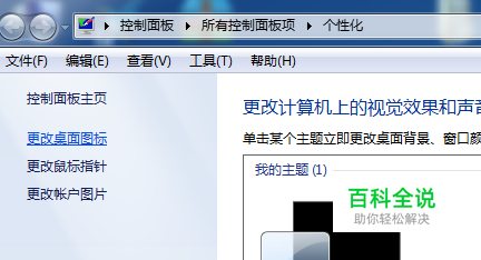 进入控制面板中的个性化页面,点击“更改桌面图标”,进入更改桌面图标设置页面。