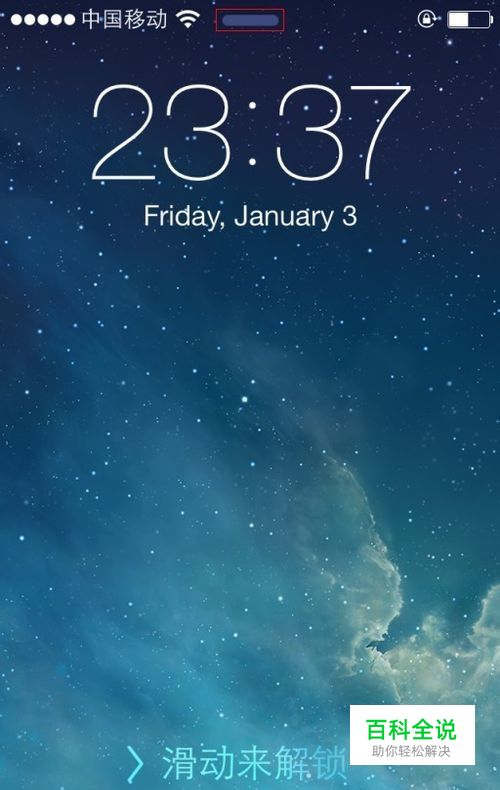 当你的苹果5S/5C锁屏后,按一下开关键或者HOME键,将会显示如图。 不知道你留意到了没有,在屏幕的顶部和底部,都有一个横条。 先说底部的吧。功能多些且最常用。