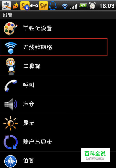 手机设置中找到无线和网络。