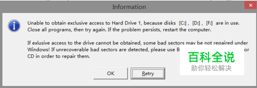 如果出现下图的错误提示,表明你开的程序太多干扰了硬盘修复程序的正常运行,你将你所有开启的程序关闭即可。