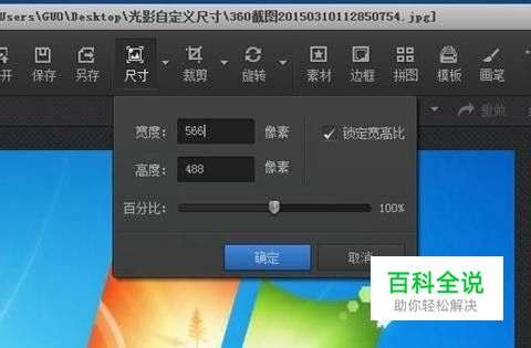 打开这张win7的桌面截图 点击 尺寸 我么可以看到它的尺寸是566x488 比小编需要的尺寸略大一些 当然我们可以在这个时候直接输入数字调整它的大小