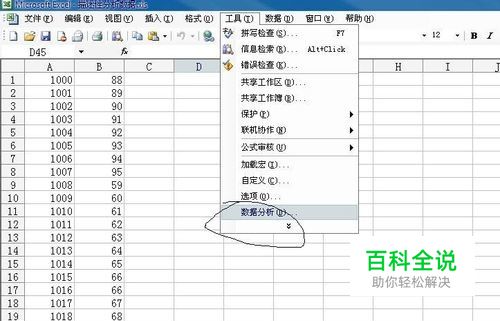点击“工具”--“数据分析”(数据分析工具库的安装如下面经验所写的),如下图。