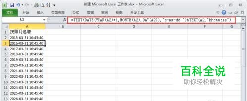 以月来递增可输入: =TEXT(DATE(YEAR(A2),MONTH(A2)+1,DAY(A2)),"e-mm-dd ")&TEXT(A2,"hh:mm:ss")