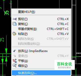 1.在AutoCAD主界面,右击鼠标再出现的下拉菜单下选择【快速选择】。