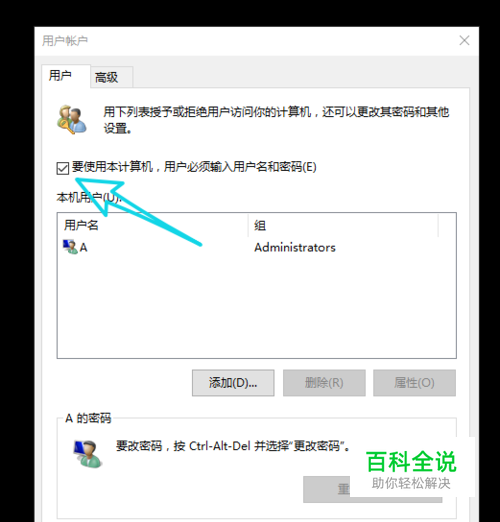 将要使用本计算机、用户必须输入用户名和密码前面的 选框取消,如图。