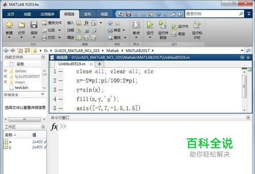 第一,启动MATLAB,新建脚本(Ctrl+N),输入下面代码: close all; clear all; clc x=-2*pi:pi/100:2*pi; y=sin(x); fill(x,y,'g'); axis([-7,7,-1.5,1.5])