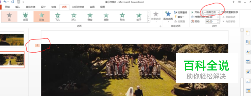 接着在动画栏中的开始一栏中把“单机时”改为“上一动画之后”,会看到图片动画标签“1”会变成“0”。之后的幻灯片同样做此操作,最后播放幻灯片即可看到效果。