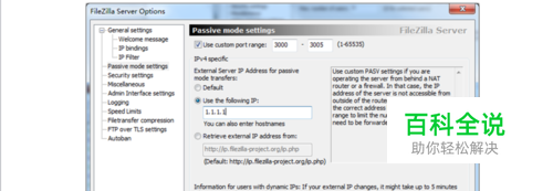 这里的环境是内网一台机器通过路由器NAT出去,需要在Passive mode settings,use the following ip写成你的出口ISP地址,在use custom prot range形成3000到3005