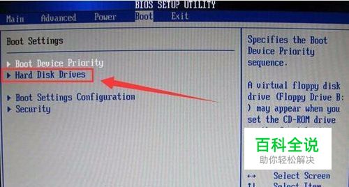 开机按esc进入bios设置界面,将界面切换到“Boot”栏,然后移动光标选择“Hard Disk Drives”回车确认,如下图所示: