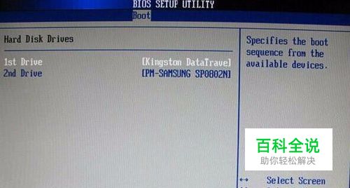 在Hard Disk Drives设置界面中,移动光标选择“1st Device”回车确认,在弹出的小窗口中选择u盘启动选项回车确认,如下图所示:
