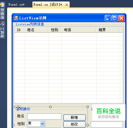 在新程序界面空白窗口上放置合适的控件:包括, 显示数据的listview控件; 用于执行增删改查的5个button按钮和对应的输入文本框。
