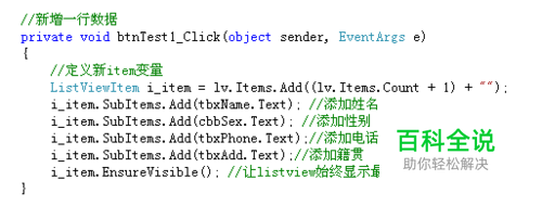 添加按钮【新增】代码 定义新item变量,将文本框中的数据导入到listview中。