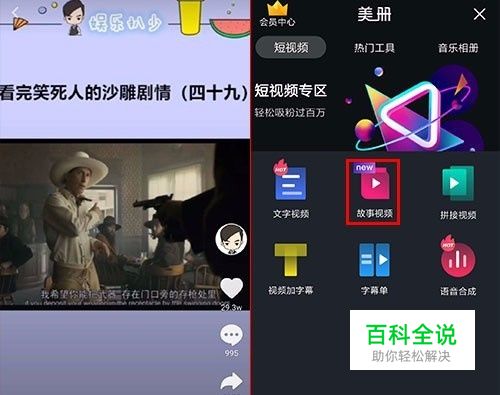 图中视频效果经常在热门看到,一些视频上面还加了字幕、描述,有的账号用这种形式制作一个系列,吸引感兴趣的人关注,你一定也有自己喜欢的电影,音乐,相声,游戏,素材不限,用美册的“故事视频”都可以制作成这种形式。