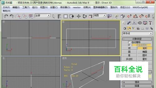 打开3dmax9,在创建面板中画一个矩形。 在前视图里比较好操作。 设置长度为100mm,宽度为260mm,角半径为2mm。
