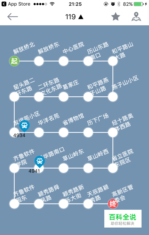 点击上方的公交车信息,如点击119,可以切换公交车方向,如将其切换成回去的公交车路线。