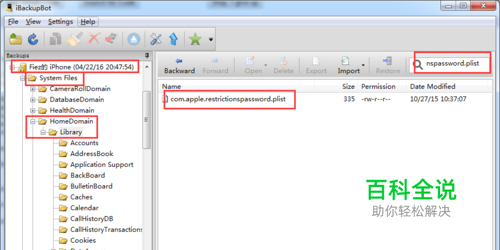 安装完成后运行,iBackupBot会自动搜索iPhone的备份文件。从备份文件中定位:System Files/HomeDomain/Library,然后在右边的搜索框中输入:com.apple.restrictionspassword.plist,可以搜索到这个密码文件。
