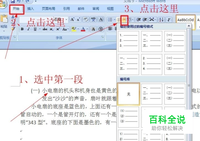 先选中第一段,点击word上面菜单栏的“开始”,点击“编号库”后面的小黑三角。在弹出的对话框中选择一种编号格式。