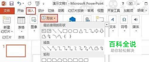 ①首先,启动PowerPoint2013,单击菜单栏--“插入”--“形状”,选择矩形。