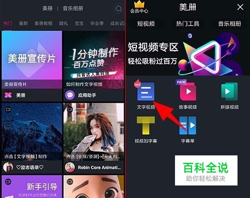 打开美册,点击箭头指向的红色按钮,短视频专区,我们要用到文字视频和拼接视频两个功能,我们先点击文字视频。