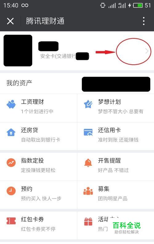 1.进入理财通个人主页,在你的头像旁边会显示你当前的安全卡。点击红色箭头区域进入。