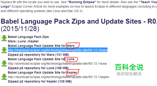 首先我们应该有一个中文版的汉化包,可以到Eclipse的官网上下载,下载的时候要看清版本要与你的eclipse的版本相同。下图红圈的为版本类型。