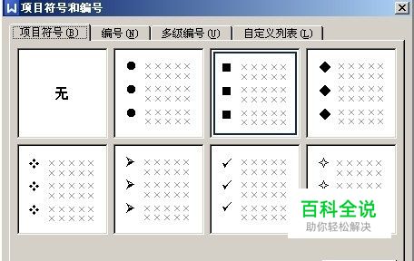 然后在“项目符号和编号”窗口中选择项目符号栏目,然后选择窗口上的符号或者自定义符号,确定后小黑块就出现了。
