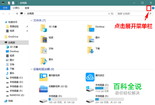 打开此电脑界面后,如果尚未展开菜单栏,点击右上角的箭头将菜单栏展开。