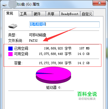 在打开的属性窗口中,可以看到笔者的U盘还有14G的空间,但是文件系统是FAT32,所以当单个文件大于4g的时候将会提示文件过大无法复制到U盘。