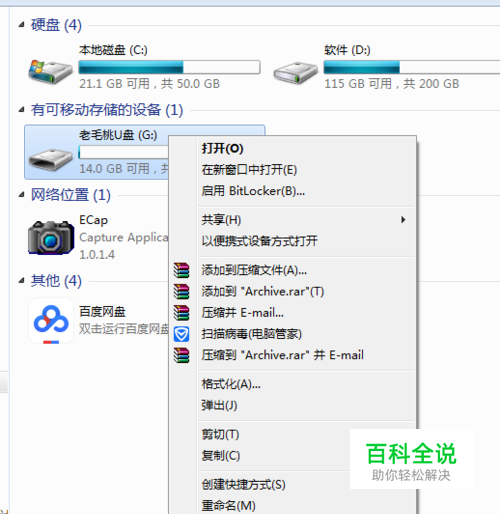 首先点击桌面上的计算机图标,打开计算机,可以看到各个分区盘符,和插入的移动存储的盘符,在此可以看到笔者插入的U盘盘符是G盘,鼠标右键点击G盘,选择属性。