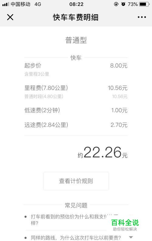 支付页面会有明细: 在我们每次行程结束之后,会有清单的显示,其中如果路上堵车,会有慢速费用,其他的款项有异议,可以直接和软件的在线客服联系,进行询问。