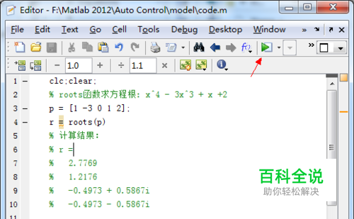 点击运行后,在Command Window显示求出的根: r = 2.7769 1.2176 -0.4973 + 0.5867i -0.4973 - 0.5867i 共4个根,可以带入检验是否正确!