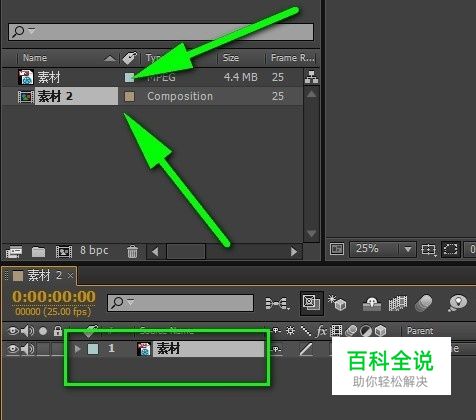 如图所示,我在AE中导入名为“素材”的视频,然后拖动“素材”到AE下方面板就自动新建了一个合成“素材2”。