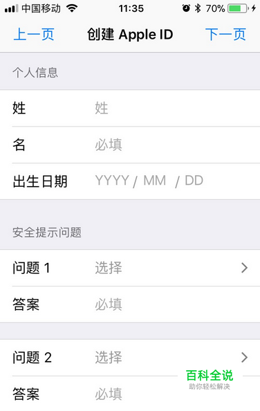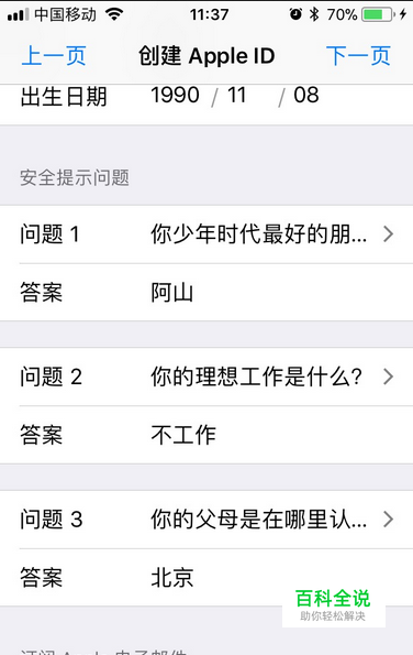 接下来依次填写个人姓、名、出生年月日、设置安全问题,注意牢记自己填写的注册的资料信息,其中出生年月日和安全问题一定要写清楚,如果你忘记Apple ID账号以后这些资料可以帮助你找回账号,建议填写真实的信息。