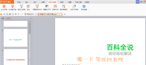 设定好后点击菜单栏中的【幻灯片放映】,在下方找到【幻灯片切换】并点击。